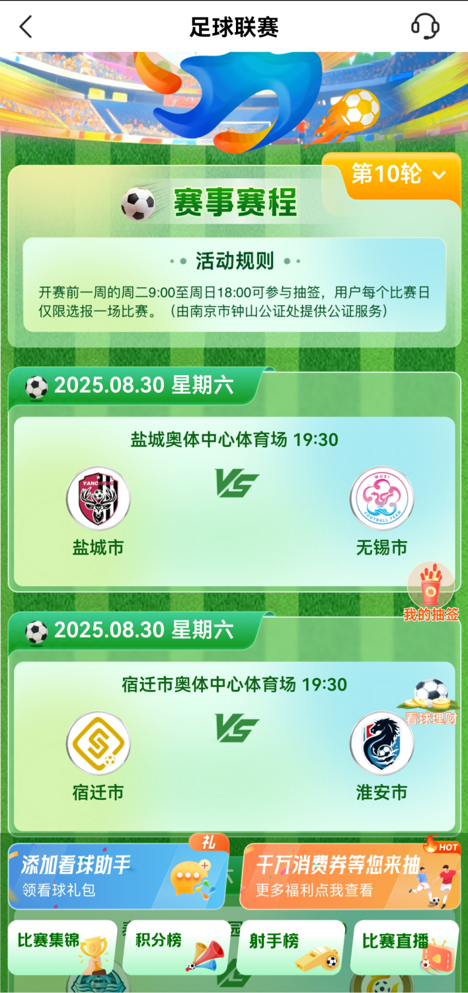 参与路径:登录江苏银行App,进入“联赛专区”选择意向观赛的场次,点击“抽签报名”即可完成登记。